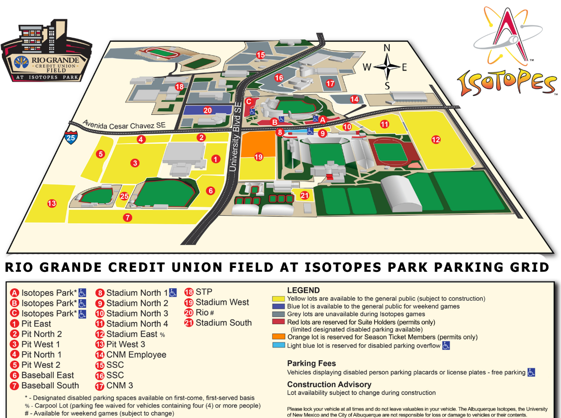 The University of New Mexico owns and controls most of the parking lots surrounding Rio Grande Credit Union at Isotopes Park. Payment for parking must be made by credit cards. Cash, Baseball Bucks, and Isotopes Gift Cards are not accepted as forms of payment at these lots.