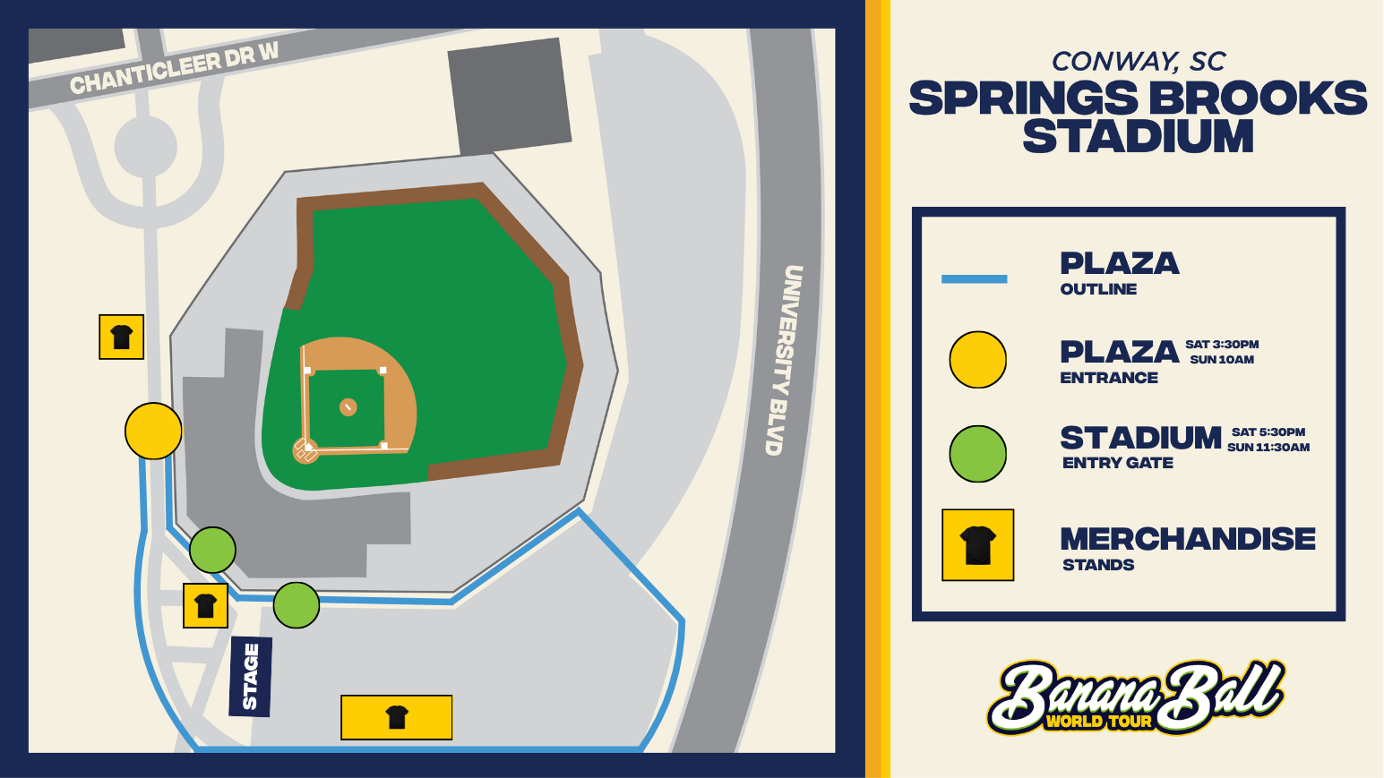 Banana Ball Merchandise will be available in the Plaza and in the Stadium. Merchandise will be available exclusively for the two teams playing in your city.