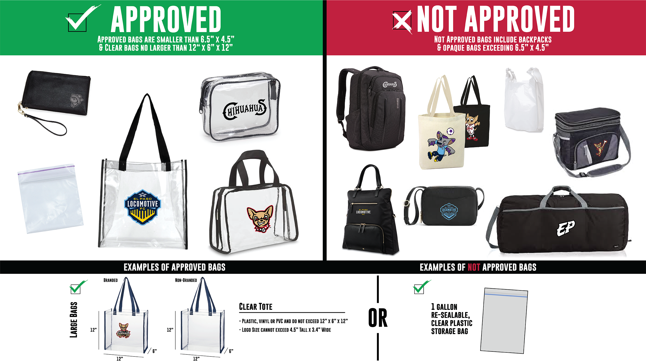 Bag policy: Southwest University Park has adopted a Clear Bag or No Bag policy. It is strongly recommended that all guests consider no bags or clear bags to assist with the health and safety of all patrons and staff. Approved standard (non-clear bags) are limited to small clutch purses or similar, and must be smaller than 6.5 x 4.5. All other types must be clear, and may be no larger than 12 x 6 x 12. All guest bags are subject to search upon entry