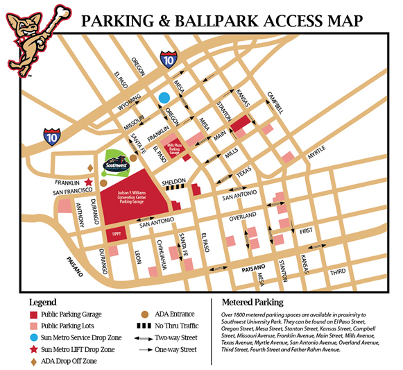 ADA Accessible Parking: Parking for ADA Guests are available at the Franklin/Durango Parking Lot (by parking pass or invite only), the Mills Building, the Union Pacific Transit Terminal, and at Destination El Paso (El Paso Convention and Visitors Bureau). Parking fees and spaces are dependent on the parking lot location.
