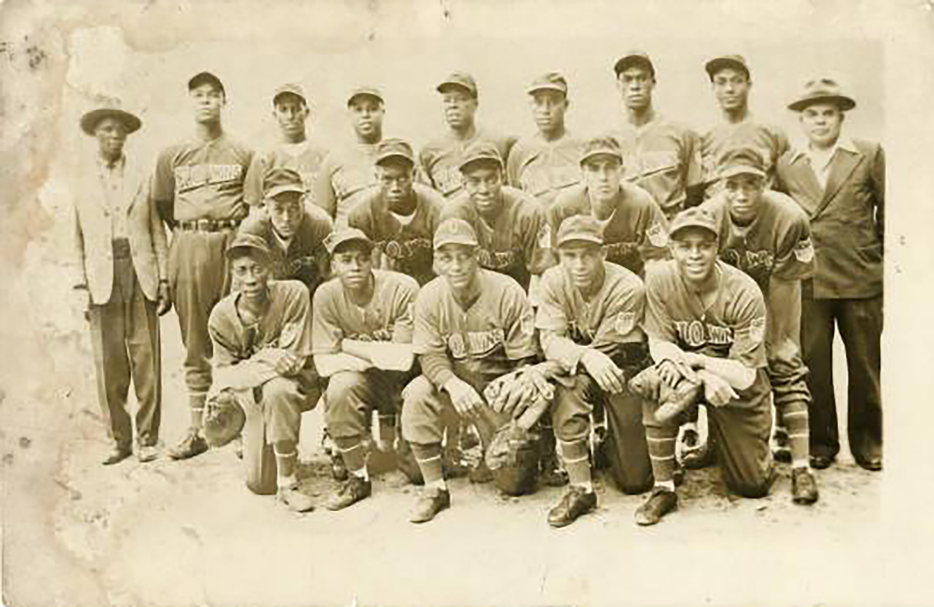 The 1943 Indianapolis Clowns team picture. Pictured are Buster Haywood (far left in civilian clothes), King Tut (kneeling far left) and Roosevelt Davis (kneeling far right).