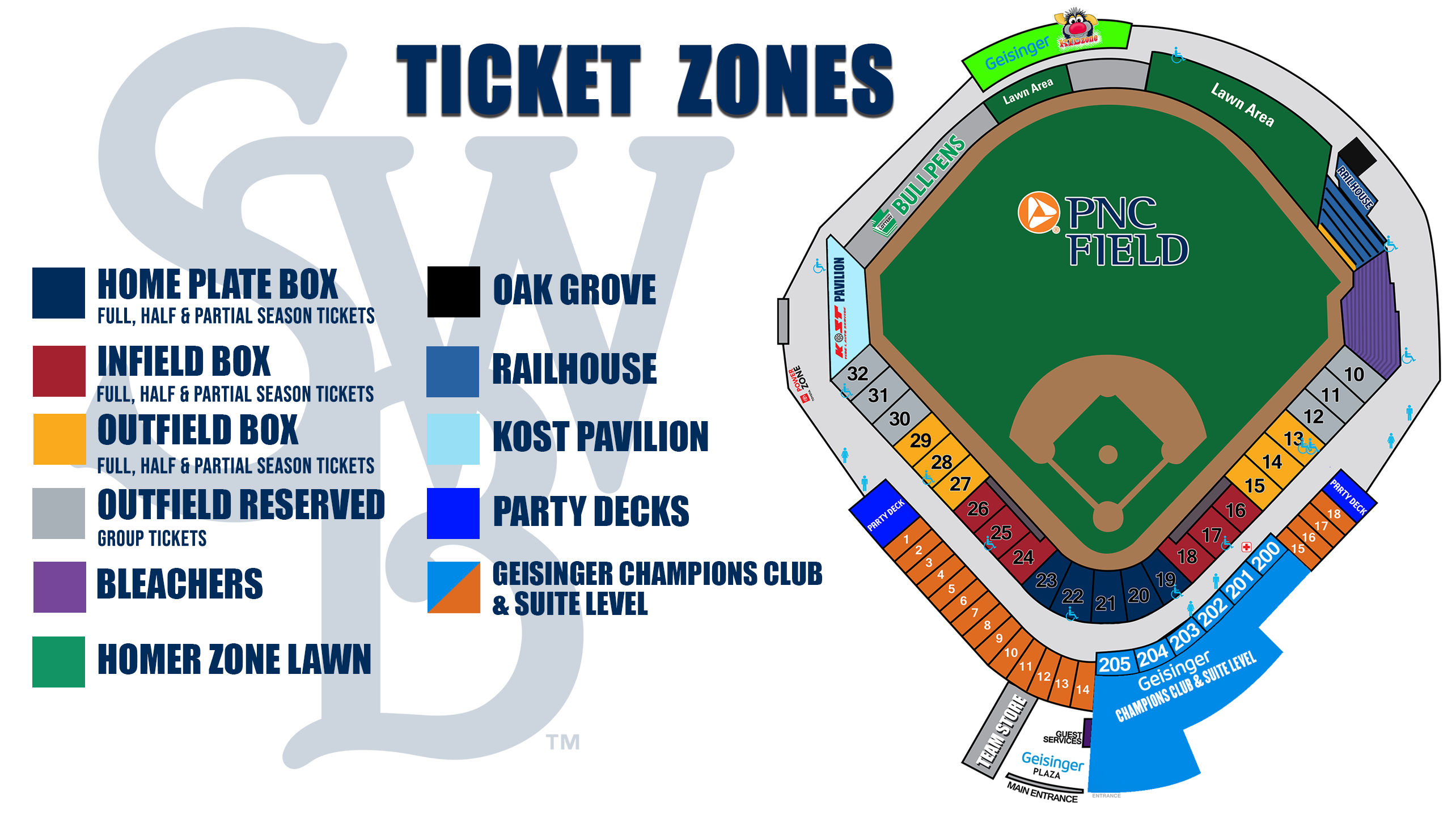 Banana Ball tickets are sold by Ticket Zones. The Ticket Zones below correspond to the ballpark map to the left.