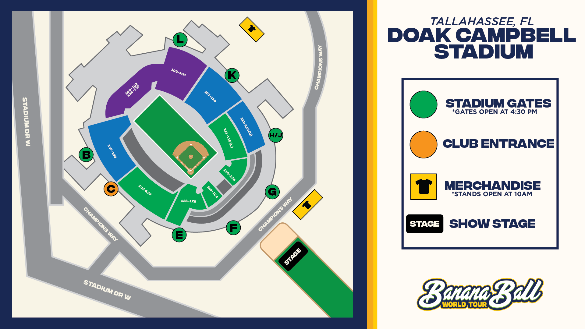 Check In: On game day, you will need to check in for the Banana Ball Backstage Experience. We recommend you are checked-in at least 30 minutes before your start time. Further information about where to check in will be shared here and emailed to you closer to game day