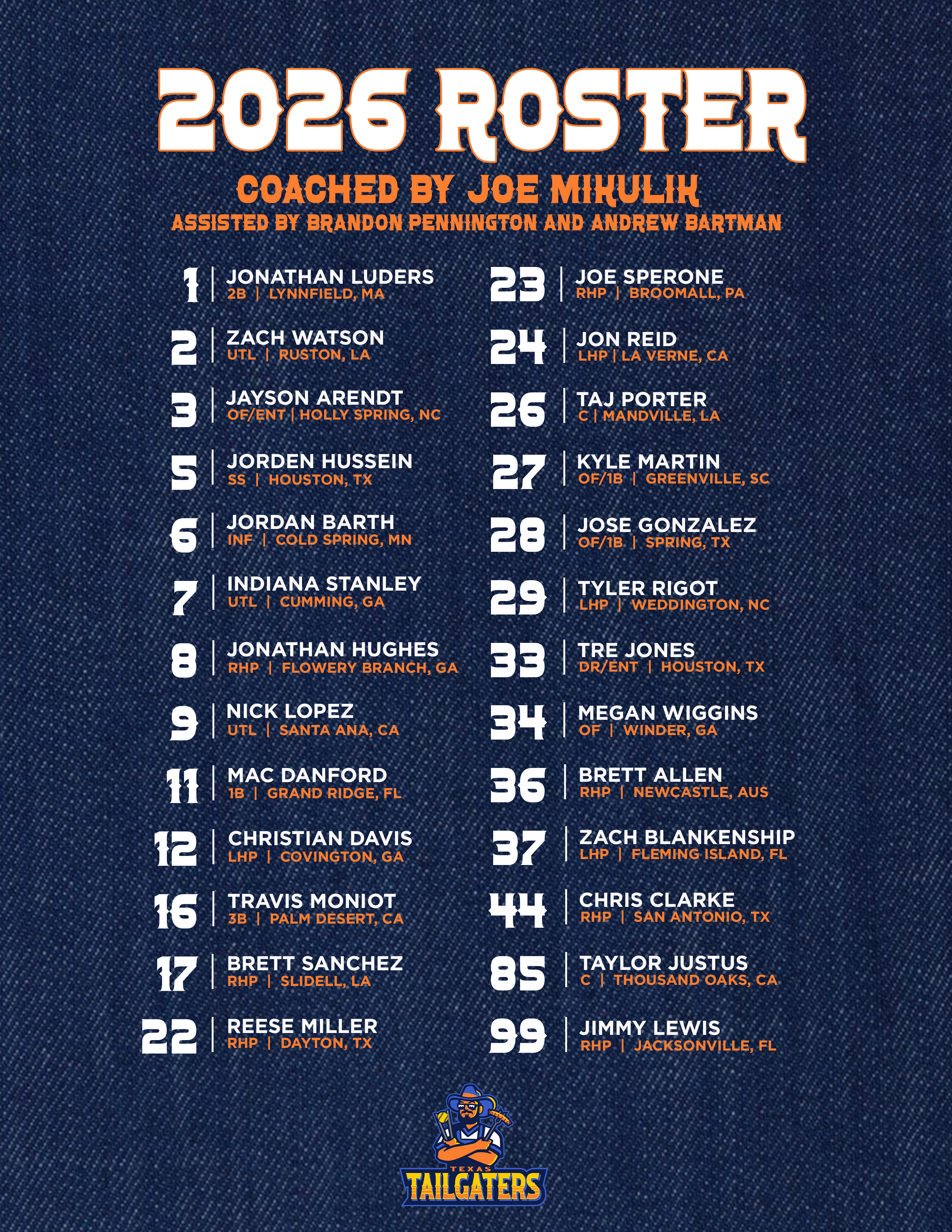 In their 2025 inaugural season, the Texas Tailgaters played in minor league and MLB stadiums across the country and headlined their own Texas tour across Frisco, San Antonio and Round Rock.